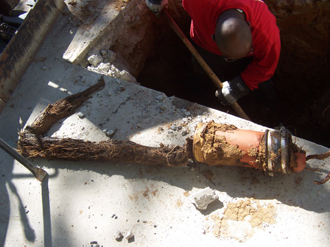 Backed-up sewer line - Sewer lines back up due to blockages. Blockages could include root intrusion, debris, grease build-up, or crushed pipe.